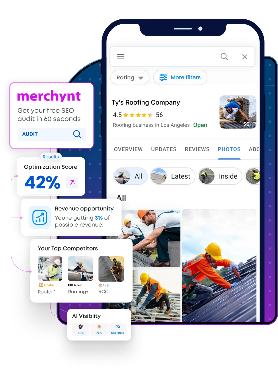 Your Google Business Profile powers Google Search, Google Maps, AI Overviews, Gemini, ChatGPT and more. Get your free GMB audit in 60 seconds — see your optimization score, the revenue opportunity in your local market, who your top competitors are, how visible you are on AI platforms, and exactly what to fix.